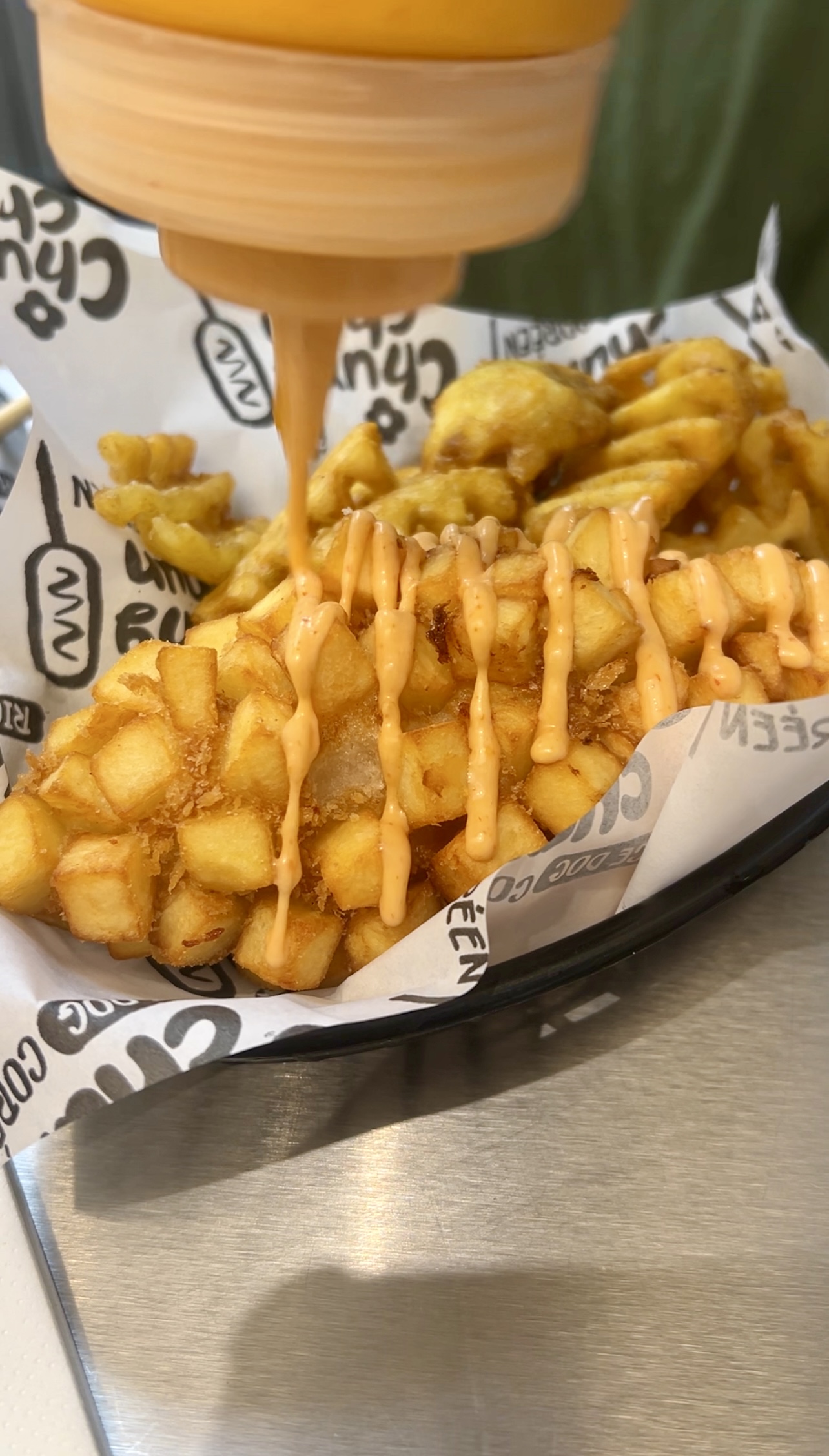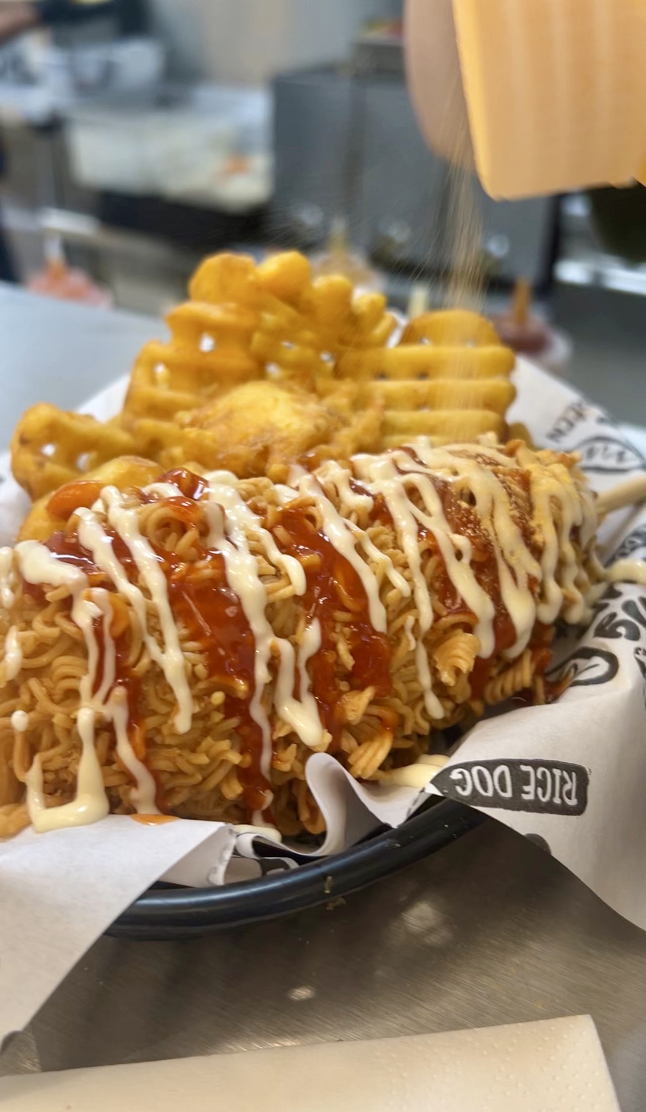 Le rice dog est servi bien chaud et ultra croustillant comme on aime, accompagné de frites Gwangjang saupoudrées de cheddar fondu.