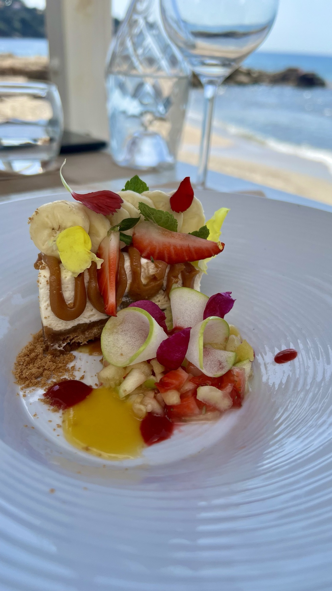 Le dessert a également surpassé mes attentes. Un banoffee banane flambée, crème mascarpone, crème caramel, servi avec une salade de fruits rafraîchissante finement coupée. La décoration était élégante avec des pétales de fleurs et de fines tranches de pommes disposées en cône.