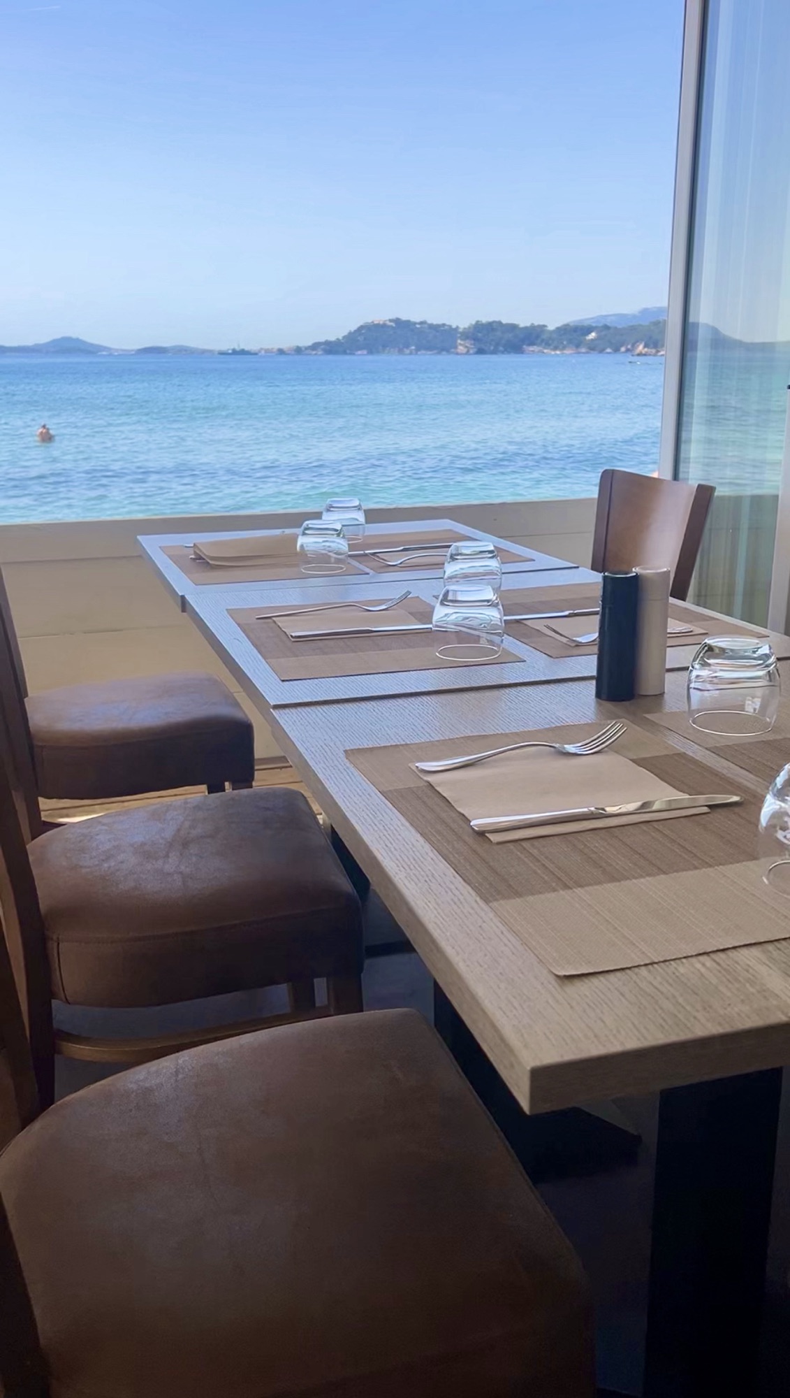 Possibilité de s’installer en terrasse ou à l’intérieur, avec de grandes fenêtres offrant une vue sur la mer.