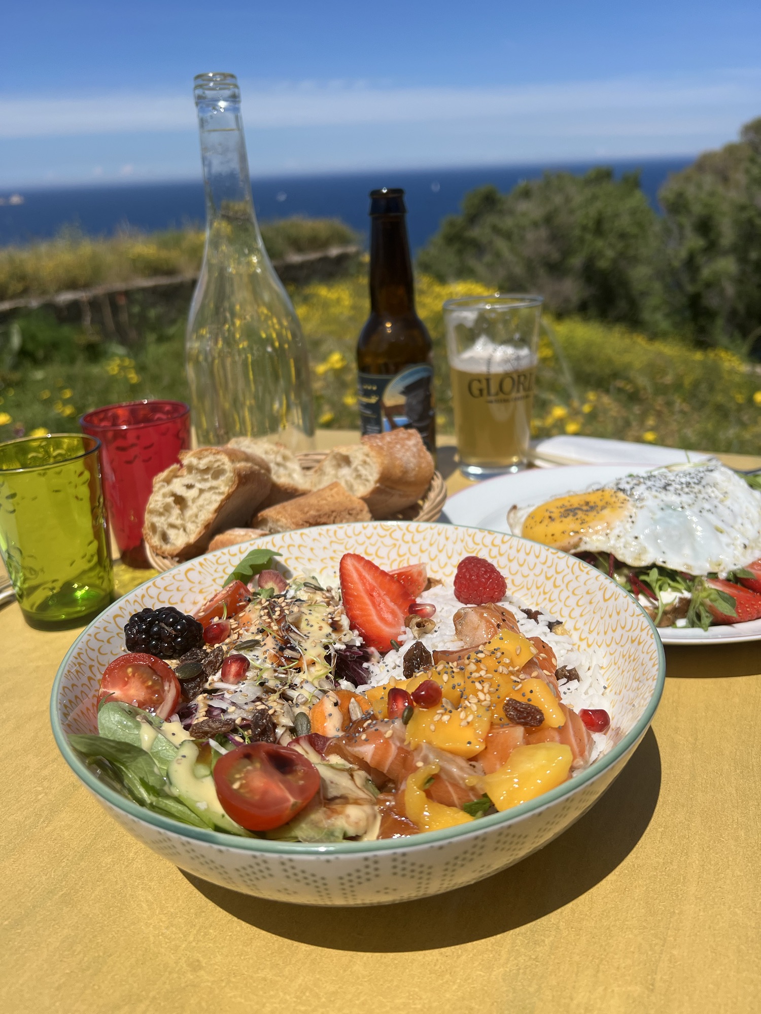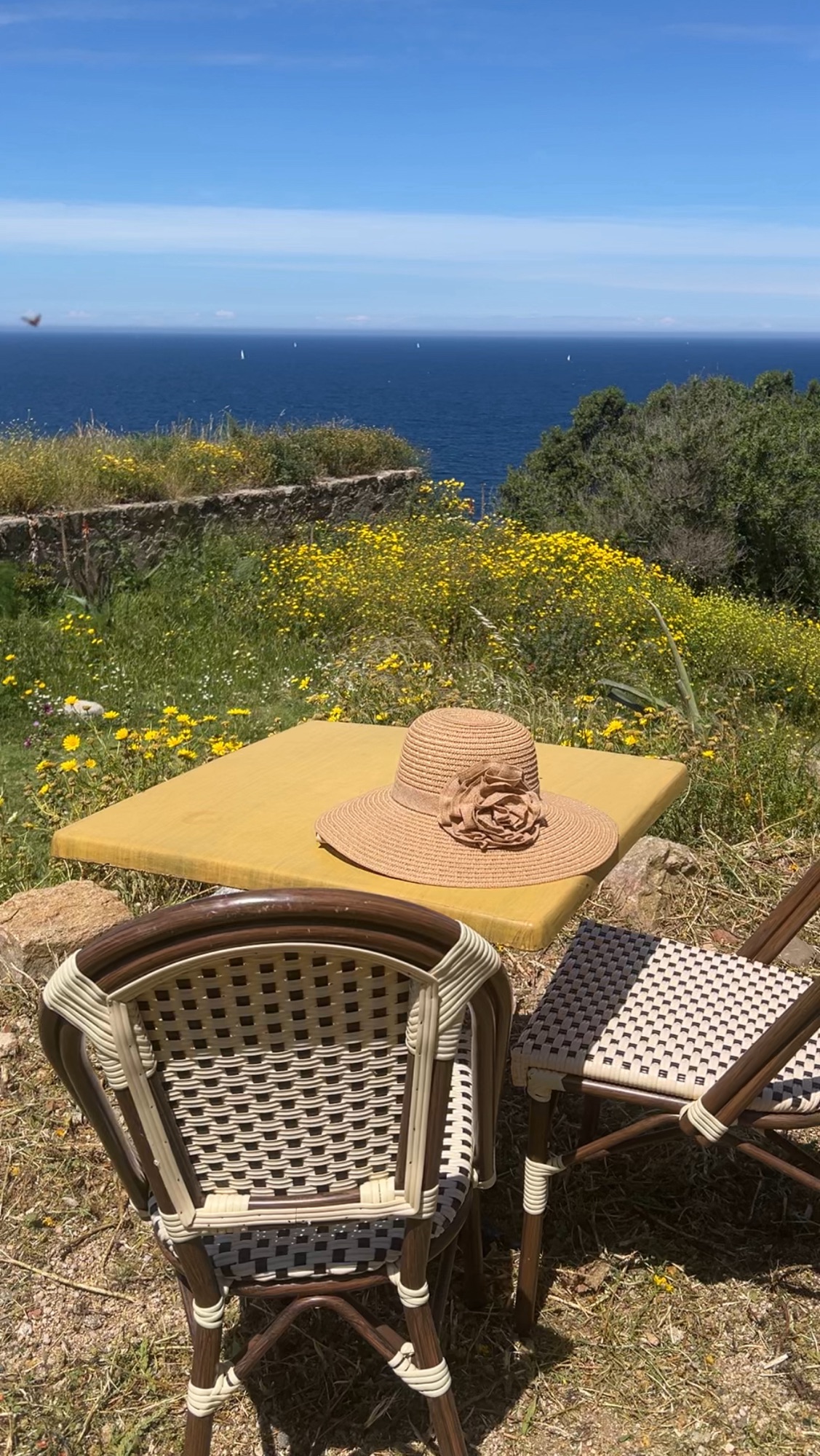 Au soleil, entourés de petites fleurs jaunes, avec la vue sur la mer c’était magnifique. Il paraît que c’est l’endroit idéal pour dîner devant le coucher de soleil qui est juste en face !
