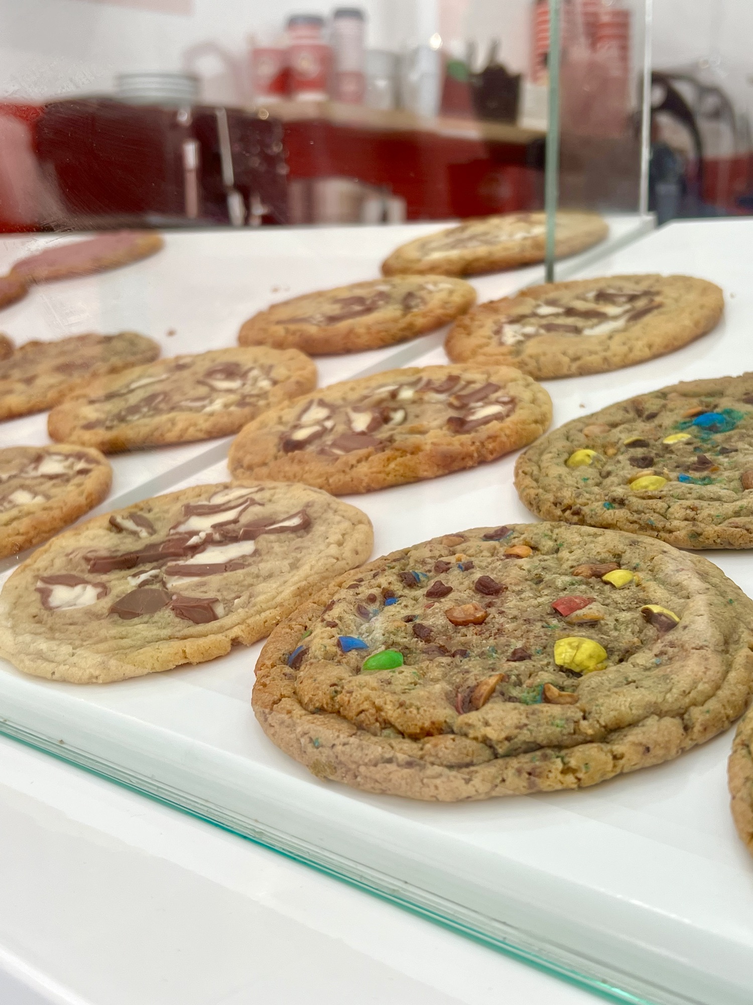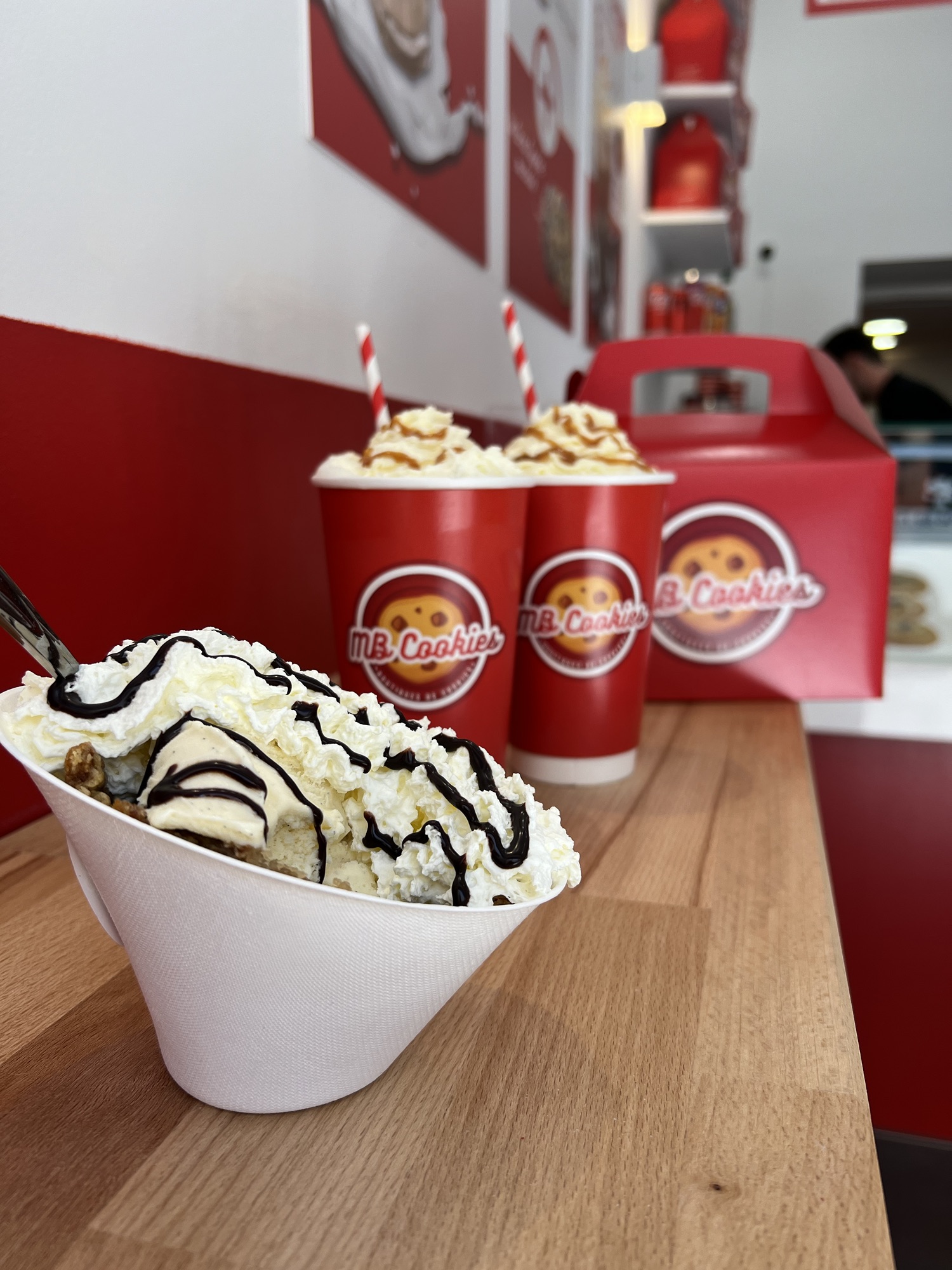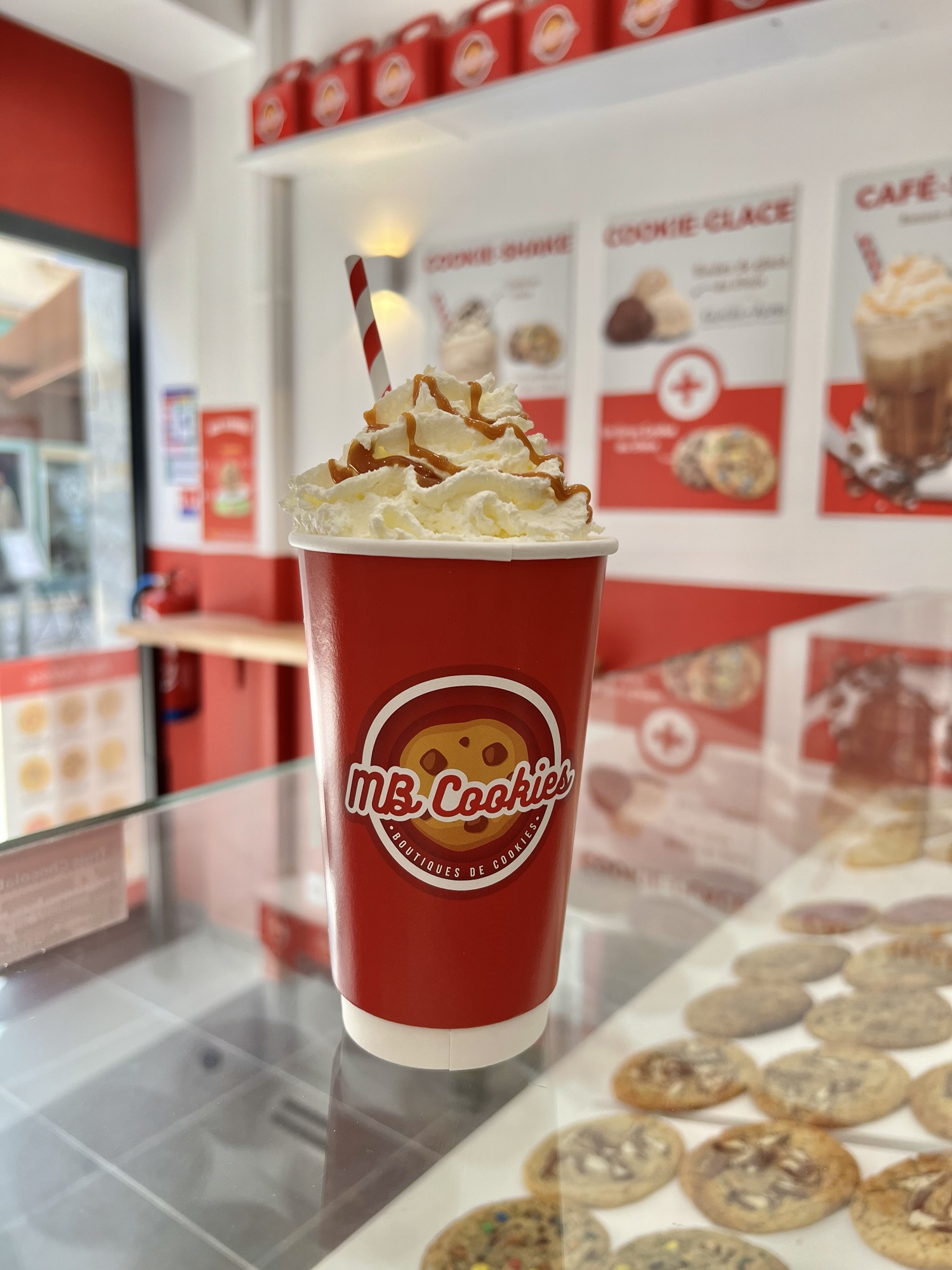 Mais ce n’est pas tout ! il y a aussi deux spécialités uniques. Le Cookie Shake, c’est un milk-shake dans lequel un cookie de votre choix est broyé, donnant au milk-shake le goût riche et savoureux du cookie choisi. Une véritable expérience gourmande ! Et le Cookie Glace, il s’agit d’un cookie de votre choix accompagné de deux boules de glace artisanale des Alpes, de crème fouettée et d’un coulis. L’alliance de la glace et du cookie est tout simplement délicieuse.