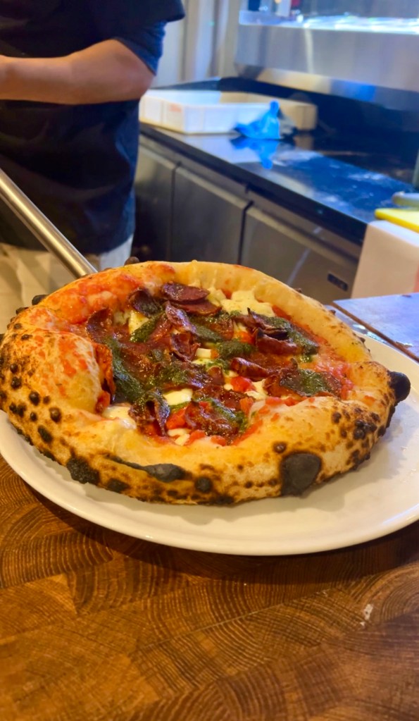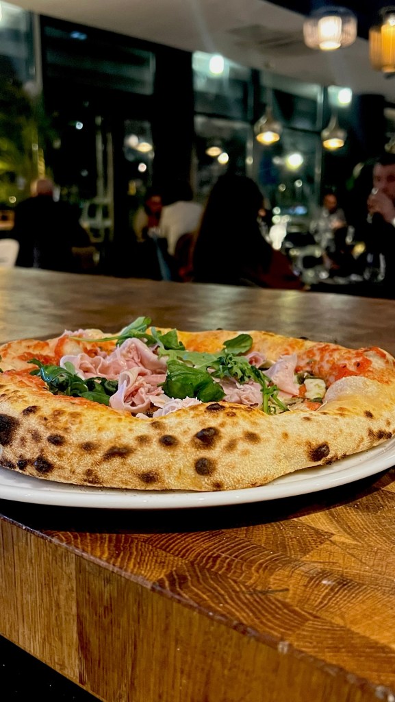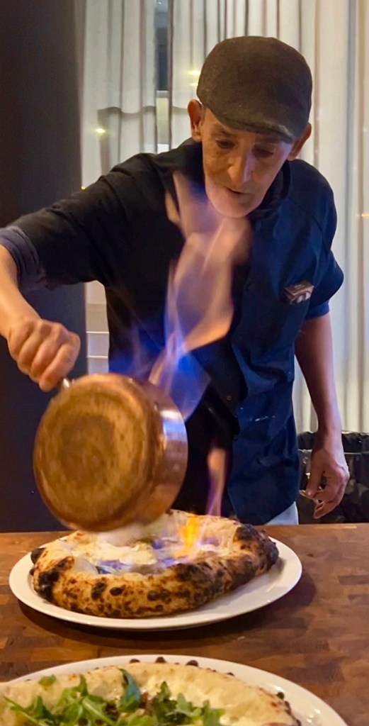 Nous avons commencé le repas avec une planche de charcuterie, fromages et tapas puis j’ai choisi ensuite : une pizza flambée, préparée et flambée devant moi, ajoutant une touche de spectacle à la dégustation.