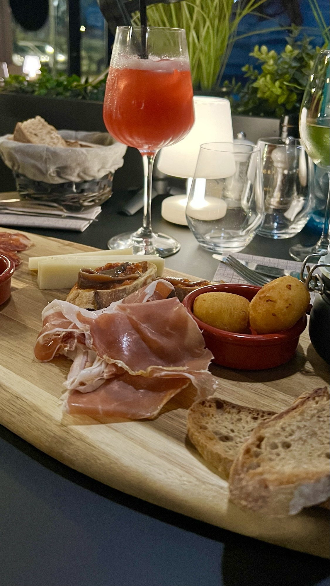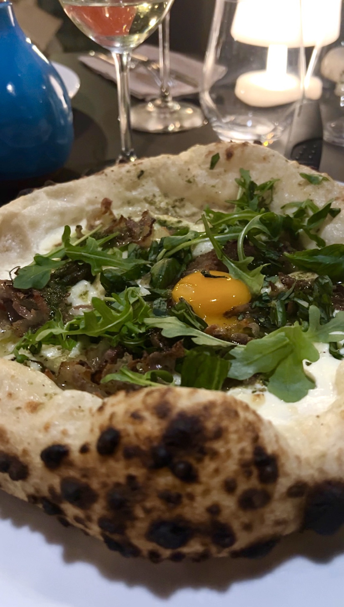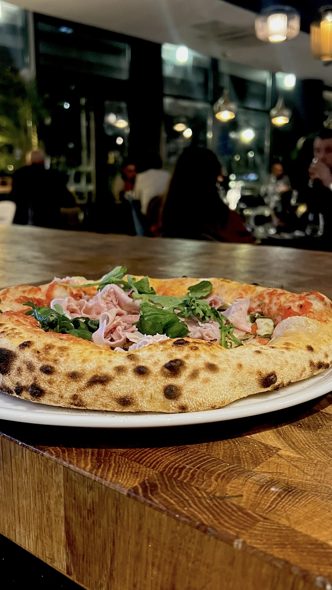Nous avons commencé le repas avec une planche de charcuterie, fromages et tapas puis j’ai choisi ensuite : une pizza flambée, préparée et flambée devant moi, ajoutant une touche de spectacle à la dégustation.